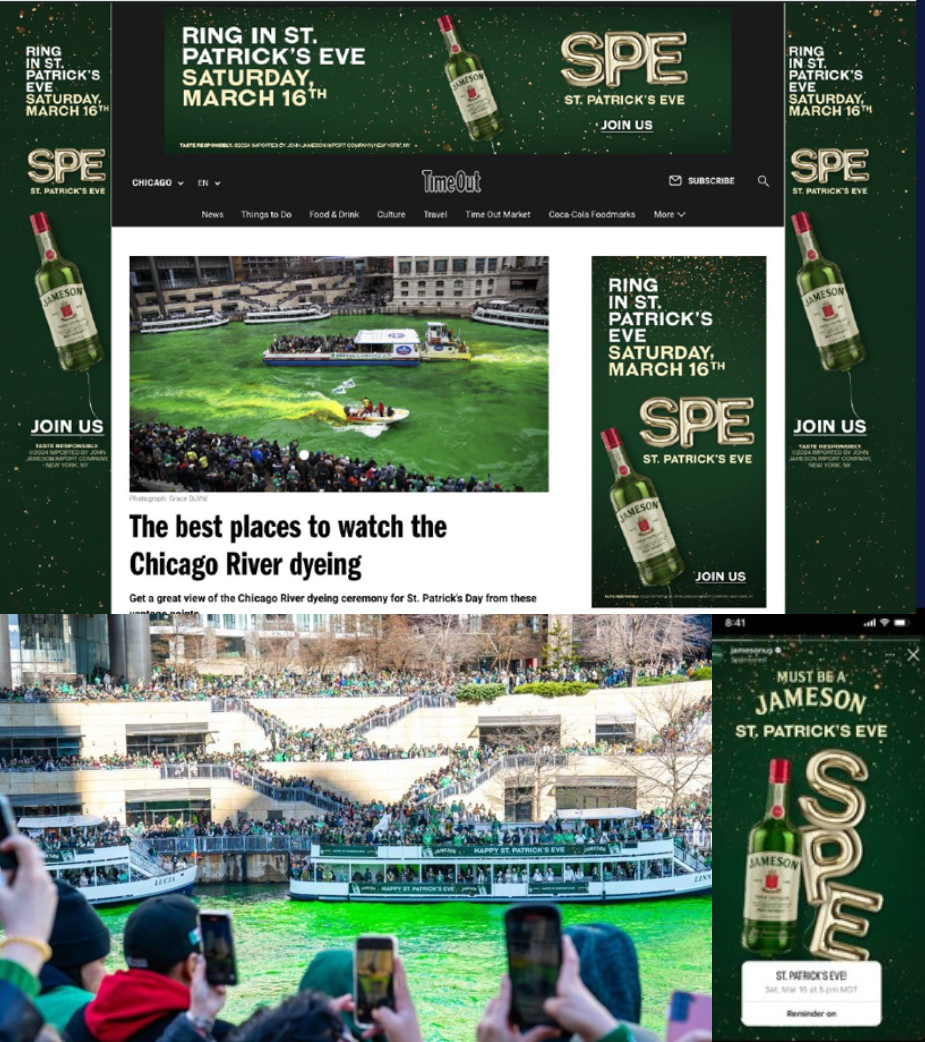 Pernod> Across the United States, excitement for SPE soared. We gave 350 bars their own countdown clocks and SPE merchandise including limited-edition jackets to mark the occasion. In Chicago, we took over ferries on the river during the annual green river dyeing. In Times Square in NYC, we hosted a blowout SPE celebration with Che and Jost that yielded 5,000 fan RSVPs. As St. Patrick’s Day (Sunday) dawned, thousands of fans decked in Jameson swag, joined us in Times Square to count down as the green ball dropped.