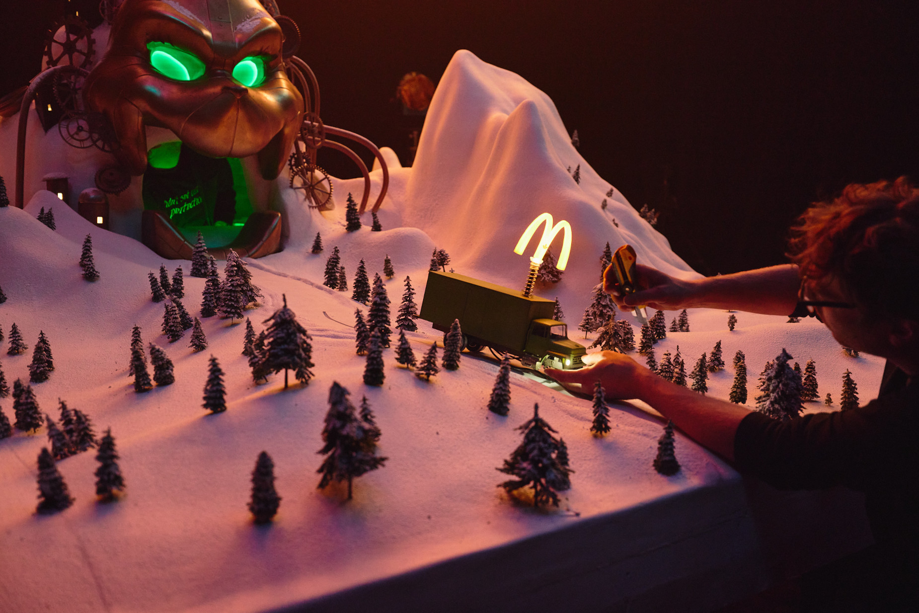Jesse> Because that tone resonated last year, we wanted to protect it and keep expanding the world in a way that felt consistent… In what absolutely nobody is calling the ‘Grinch McDonald’s Cinematic Universe’ (the GMCU). We’ve created our own visual language for this world that’s real but heightened. It's very tactile, practical, and miniature driven, to capture the darkly surreal twisted inventiveness that makes the Grinch so lovably Grinchy.
