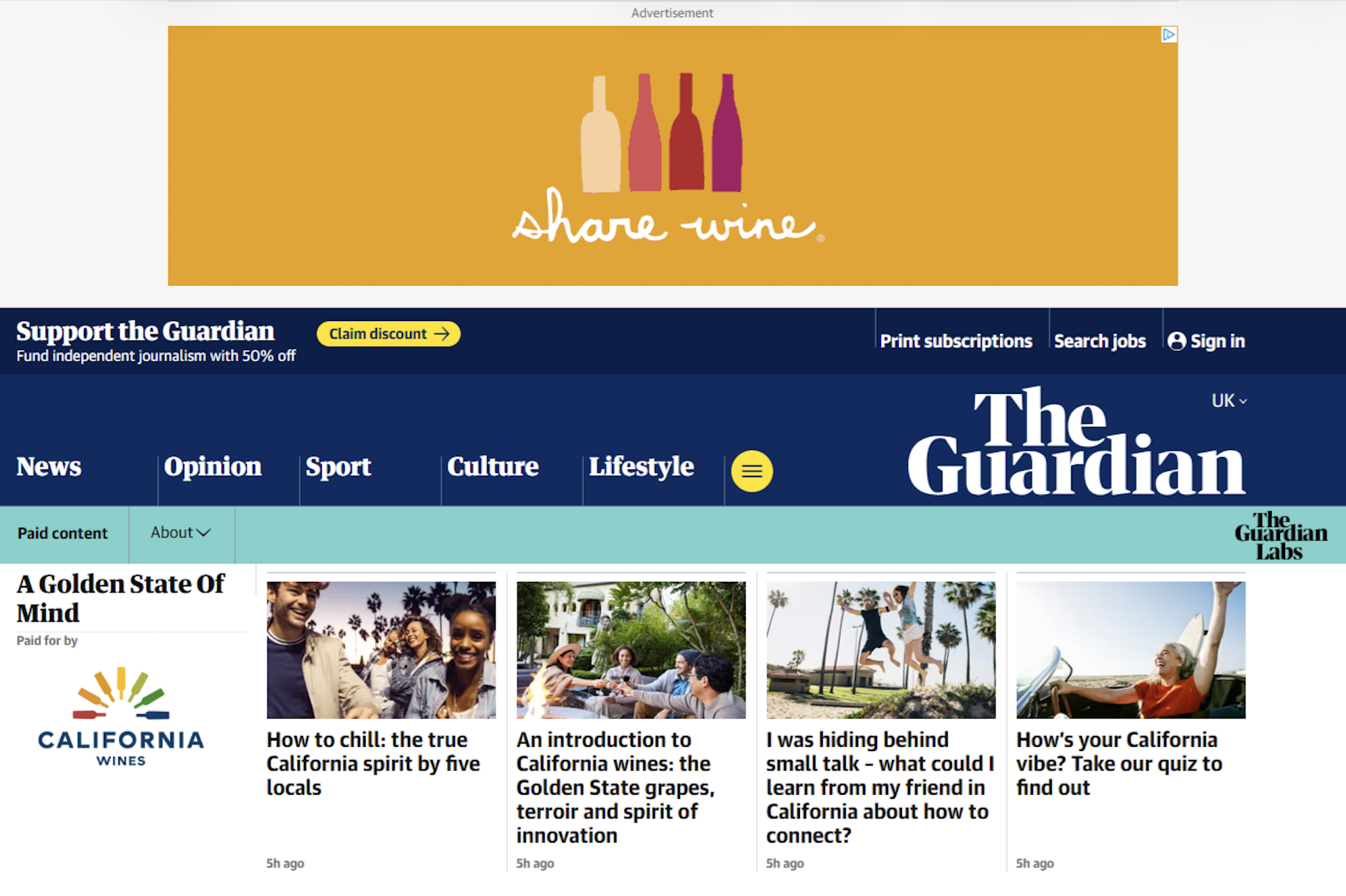 The media is structured in two distinct bursts. The first, leads with the Guardian Labs content series and runs through to the end of February focusing on cultural relevance with focused lifestyle content and shifting perception of California culture. It is accompanied by audio ads which run across the Guardian's podcast network, and a broader podcast outreach including host reads, on Alan Carr’s 'Bottoms Up' wine tasting podcast series.