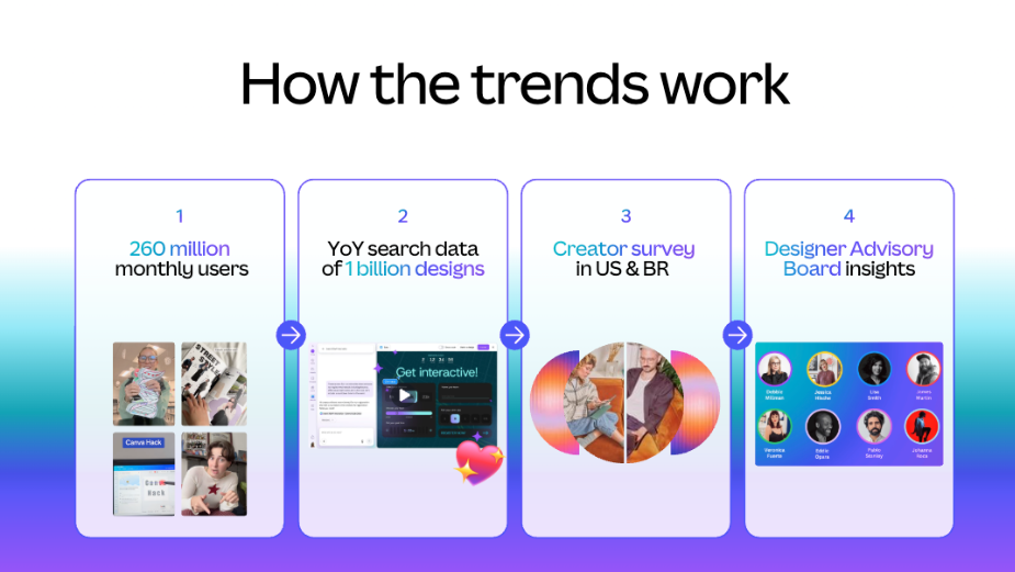 Each of our 2026 Design Trends is based on what we’re seeing grow across our community. We started the research in July by looking at year-over-year growth across more trending search terms, comparing January–June 2024 with January–June 2025. Following that, we then surveyed 1,000 creators in key markets like the U.S. and Brazil to understand how they’re feeling about design, AI, and where creativity is headed.