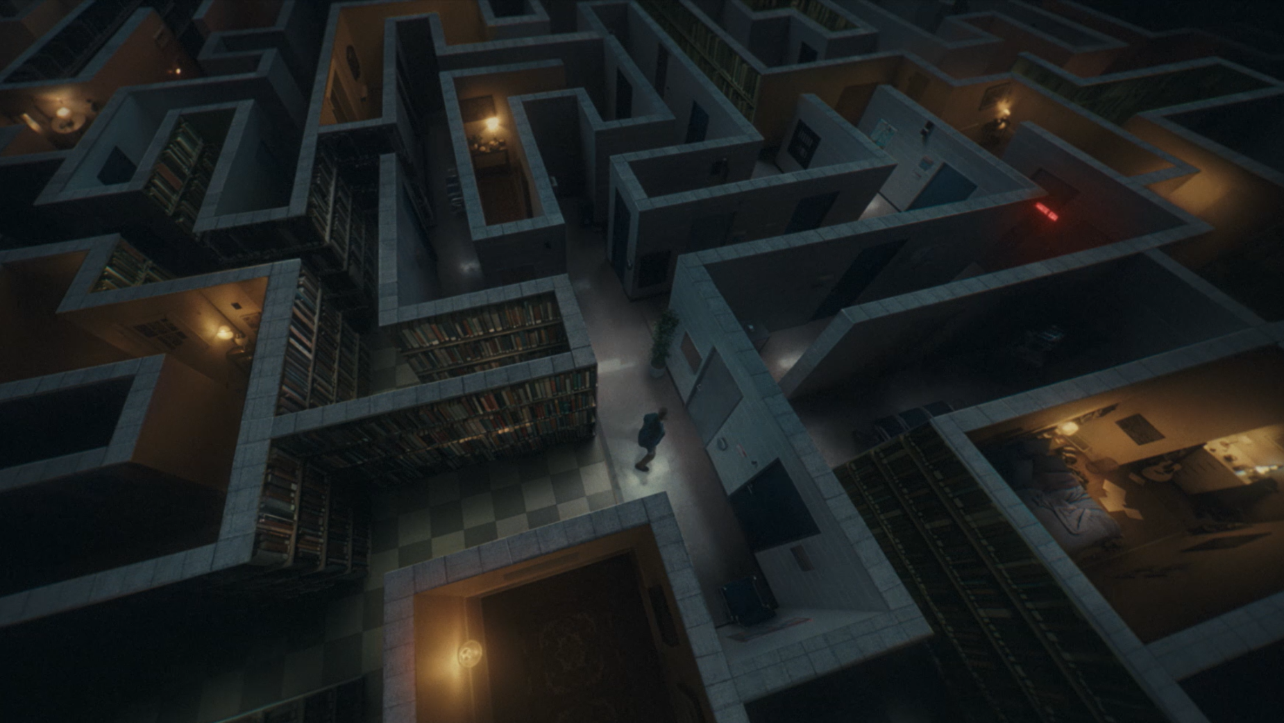 Dominik> The maze environment was constructed by first shooting the hero talent from a high vantage point, simulating the angle and perspective of the maze. A base 3D model of the maze was then created, and the individual hallway details were generated using a combination of AI, 3D elements, and matte painting to produce variations that matched the aesthetic of the home, library, and hospital environments captured. Our VFX team generated countless iterations, followed by meticulous compositing and roto work to seamlessly integrate the live-action footage with the generated environments. This process allowed for the refinement of design details, lighting, and texture, ensuring the maze accurately reflected the rest of the spot's visual language.