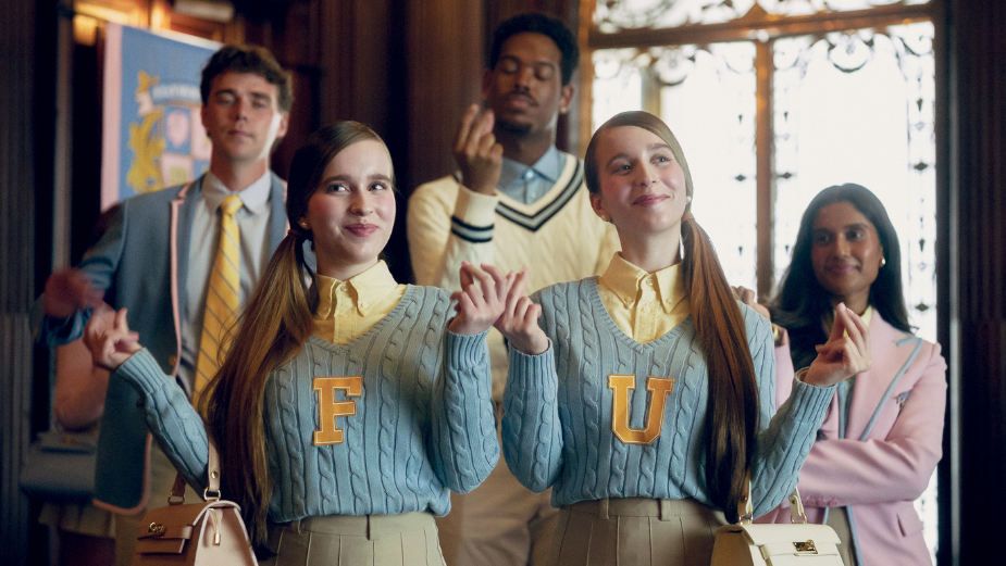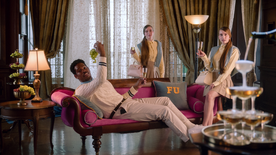 The spot immediately immerses viewers into the Featherstone universe; students sip tea, ride horses through the courtyard, and balance books on their heads. In the midst of it all stands the campaign’s protagonist, distracted by the decadence of the scene that she doesn’t quite fit into.