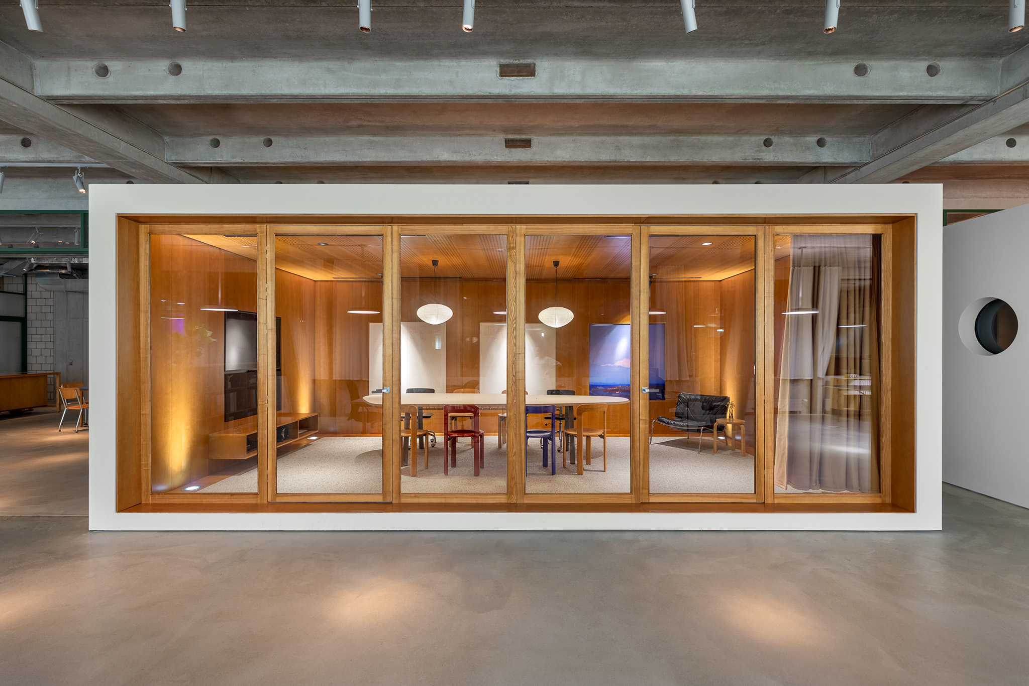 The design concept draws inspiration from the company’s name, Dynamic Frame, reflecting the fluid and adaptable nature of film production. The office features a grid layout with cube-like rooms (of course in a 4:3 aspect on the floor plan), glass elements, versatile furniture, and carefully considered acoustics to support multiple functions, from brainstorming sessions to client presentations and post-production work.