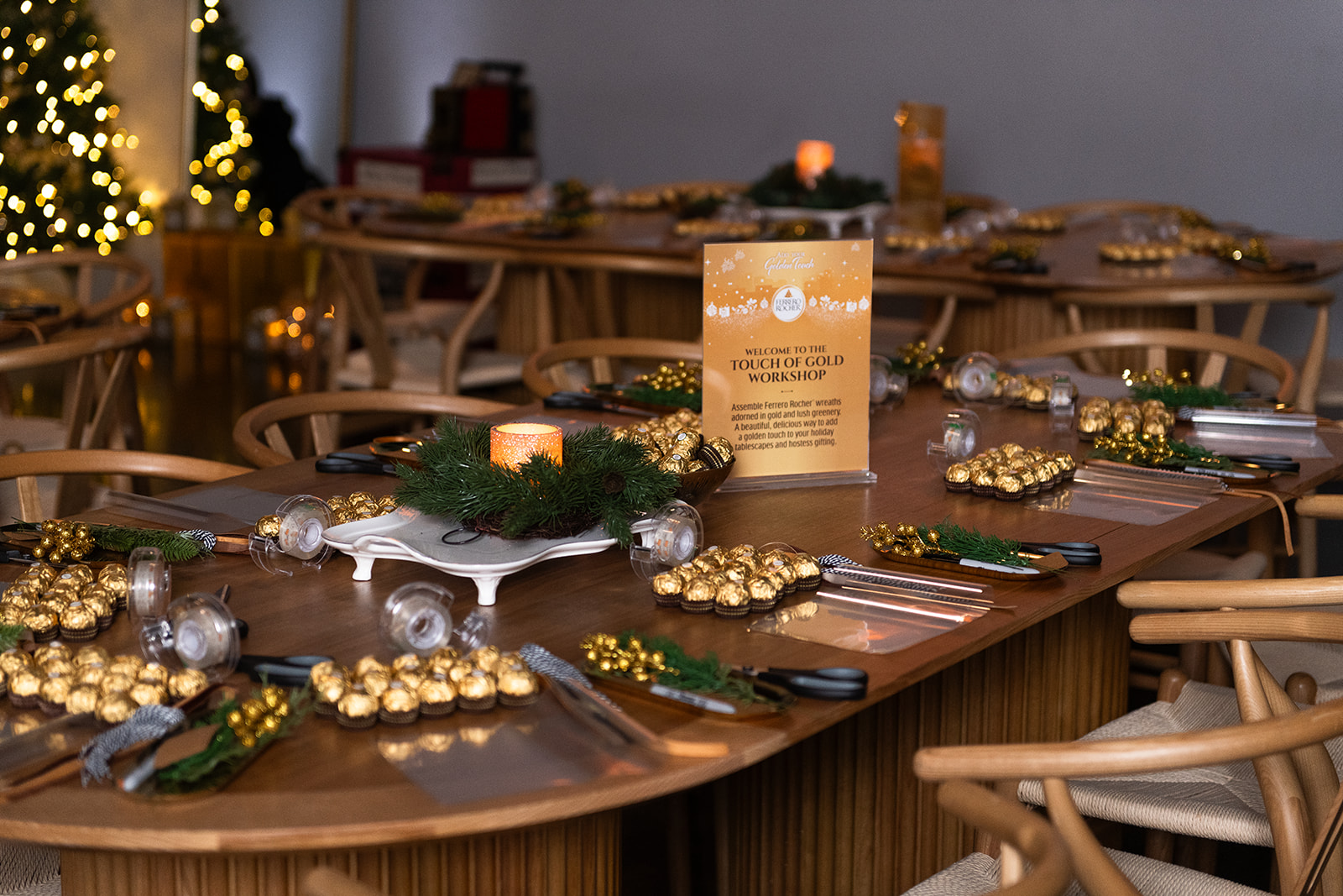 On December 8th, select contest winners were treated to a one-of-a-kind Golden Dining Experience at Arcadia Earth in Toronto. Guests enjoyed an elevated evening featuring Ferrero Rocher® inspired cocktails and canapes, followed by a hands-on Touch of Gold workshop led by hosting expert Jasmine Baker. During the workshop, attendees created their own handmade Ferrero Rocher® wreaths designed as elegant keepsakes for holiday table settings or hostess gifts.