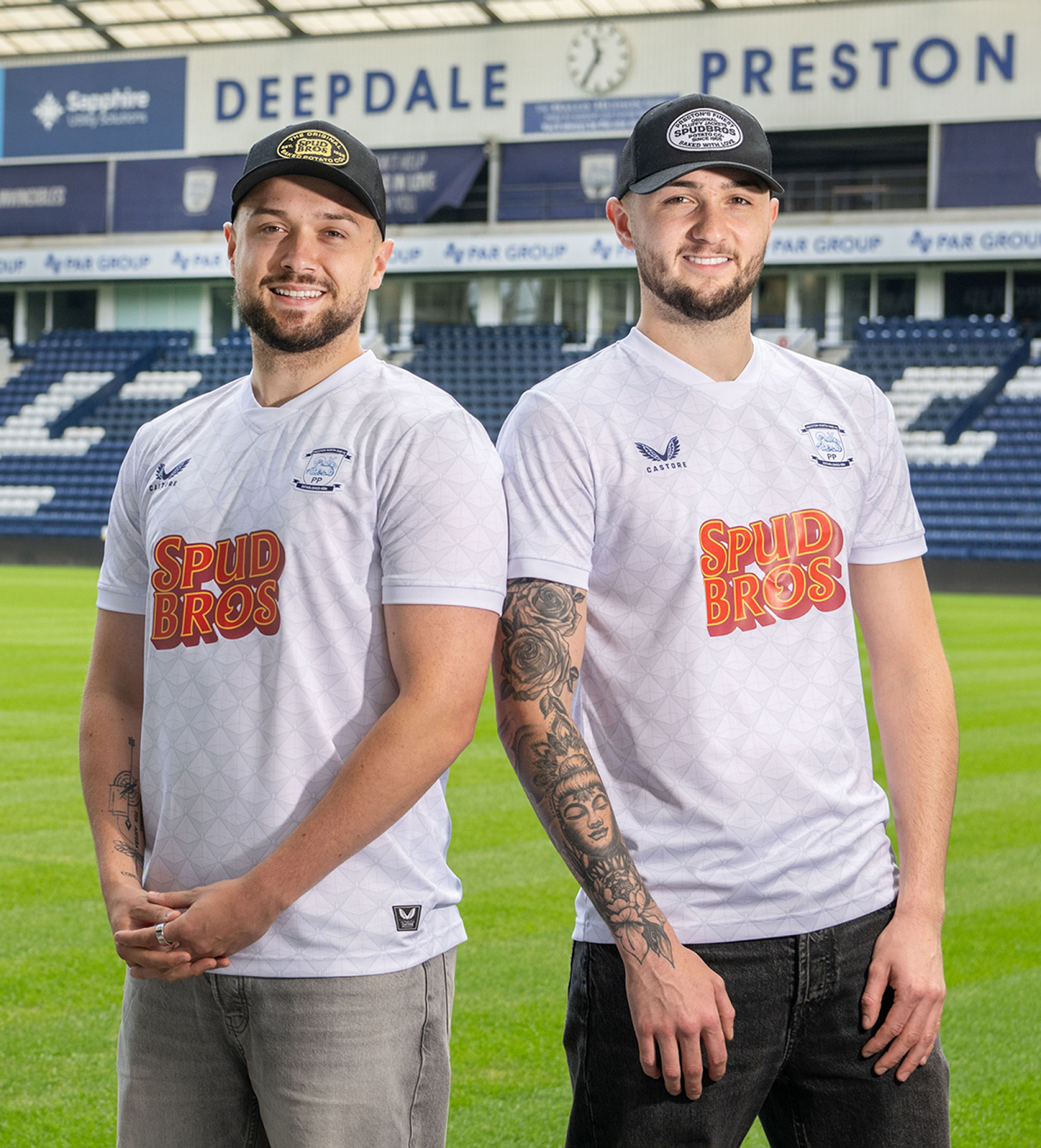 Spud Bros is a small, family‑run potato (jacket potato) business from Preston, founded by two local brothers, Jacob and Harley Nelson, who built their brand by selling potatoes out of a van and growing a social media presence (over 7 million total followers across all platforms). Now, they are front and centre of their boyhood club’s jerseys.