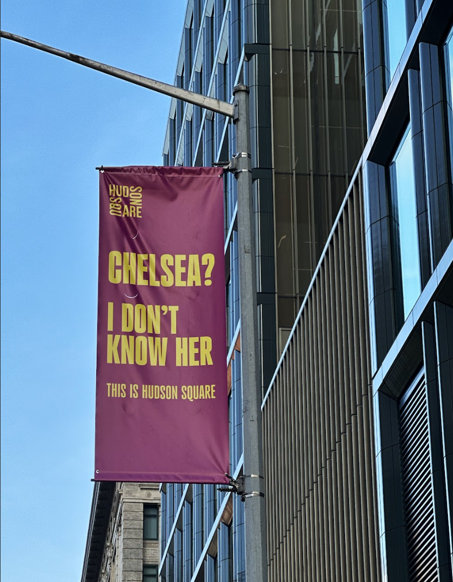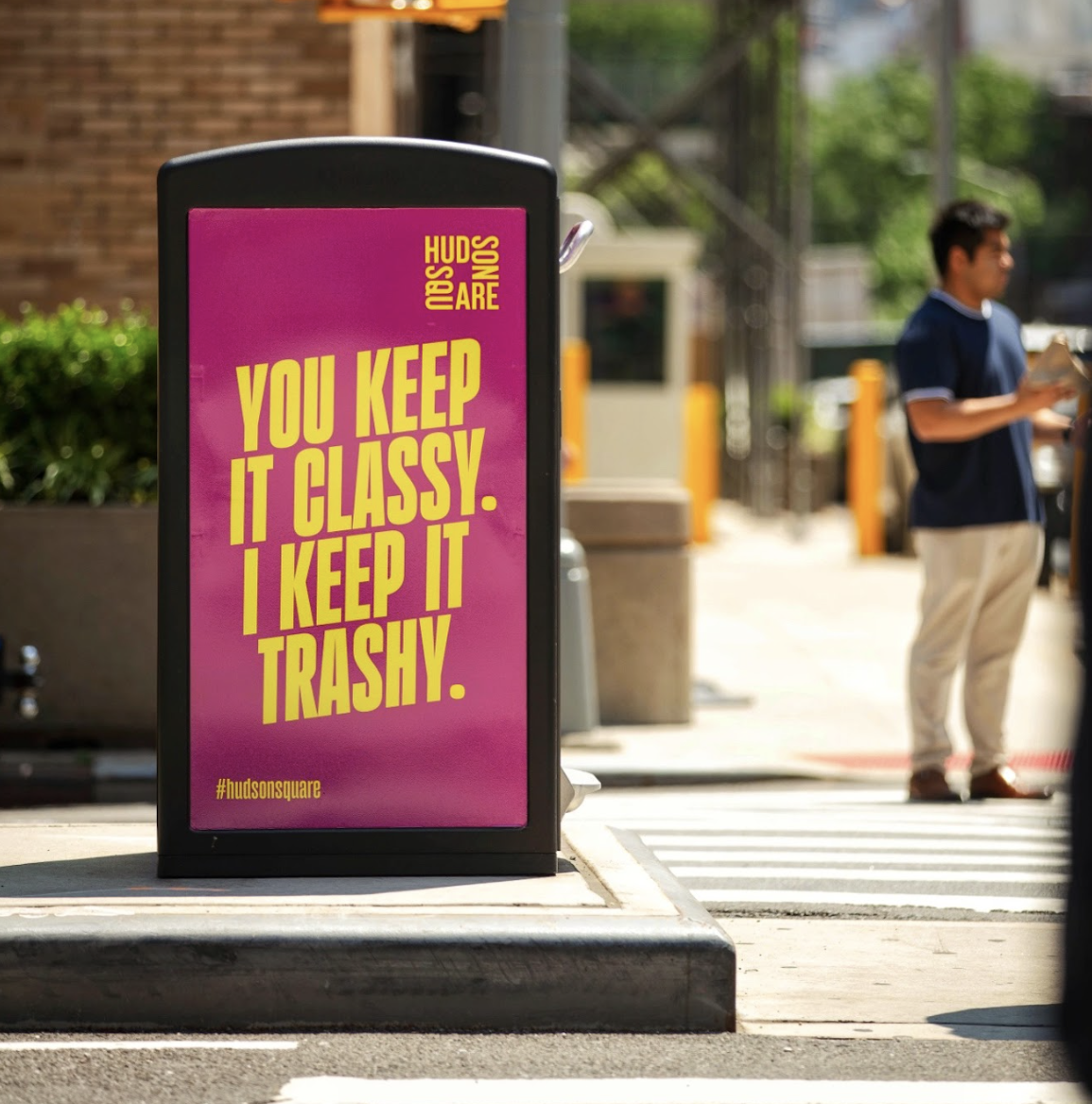 The rebrand campaign leaned into the language of insiders, using familiar city objects as its canvas. Trash cans carried cheeky lines like 'Bin there, dumped that' and 'Now accepting Tribeca trash,' while light pole banners asserted a sense of place with declarations like, 'Chelsea? I don’t know her. This is Hudson Square.'