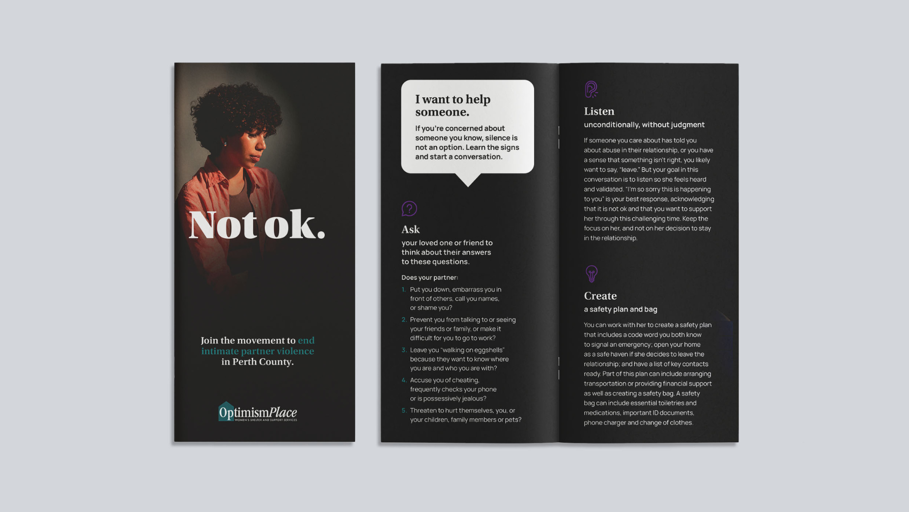 We didn’t come with preconceived ideas, this focus was a result of our consulting work with the client and their stakeholders. This stemmed from the idea of helping people in a rural community who assume that there are very little to no issues with this topic in their community understand how to keep an eye out. So it made more sense to focus on raising awareness of the signs of coercion and control, rather than physical, mental and sexual abuse.