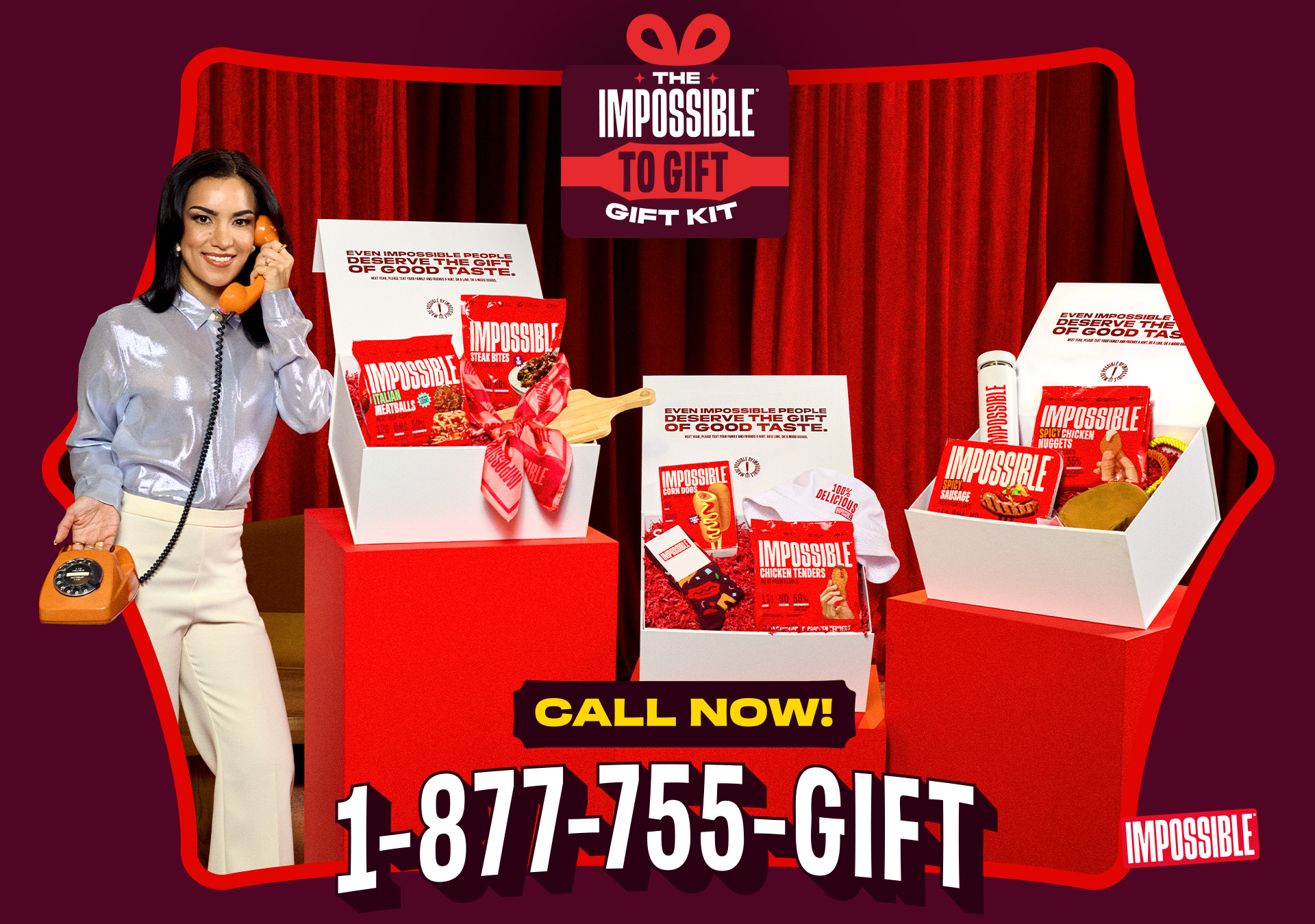 Feast your eyes on 'The Impossible To Gift, Gift Kit' and check out three custom inspo vignettes with food fits for the fancy, spicy and snacky. Each kit features an array of Impossible plant-based products that include: Impossible's Italian Meatballs, Steak Bites, Corn Dogs, Chicken Tenders, Spicy Sausage and Spicy Chicken Nuggets.