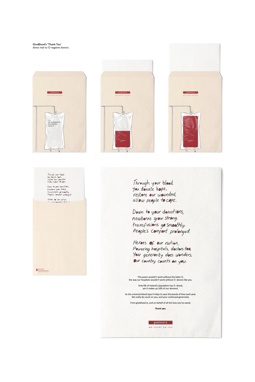 Josh Behan, strategist at TBWA, added, “All donors are incredibly important to the IBTS, but the universality of O negative blood means these donors are called upon more often. And being contacted frequently by SMS or phone call can sometimes feel a bit transactional. We knew that with such a personal medium as direct mail, we had an opportunity to counter that feeling and deliver a truly heartfelt, well-deserved thank you.”