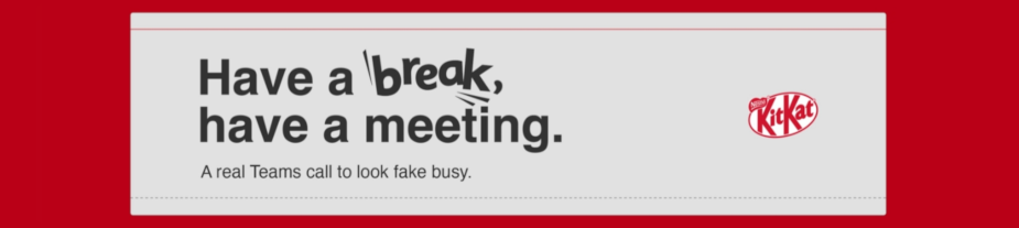 With KitKat’s latest 24/7 teams call, employees can block their calendars anytime they need a quick reset. After all, nothing quite says 'do not disturb' like a perfectly boring-looking presentation, and that 'I am on a call' gesture.