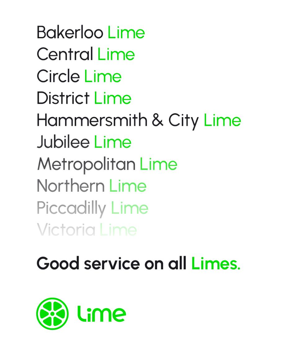 Created by The Or, ‘Good Service on All Limes’ takes the iconic tube line names and places a Lime twist on them, reiterating how its bikes are always there to keep the city moving.