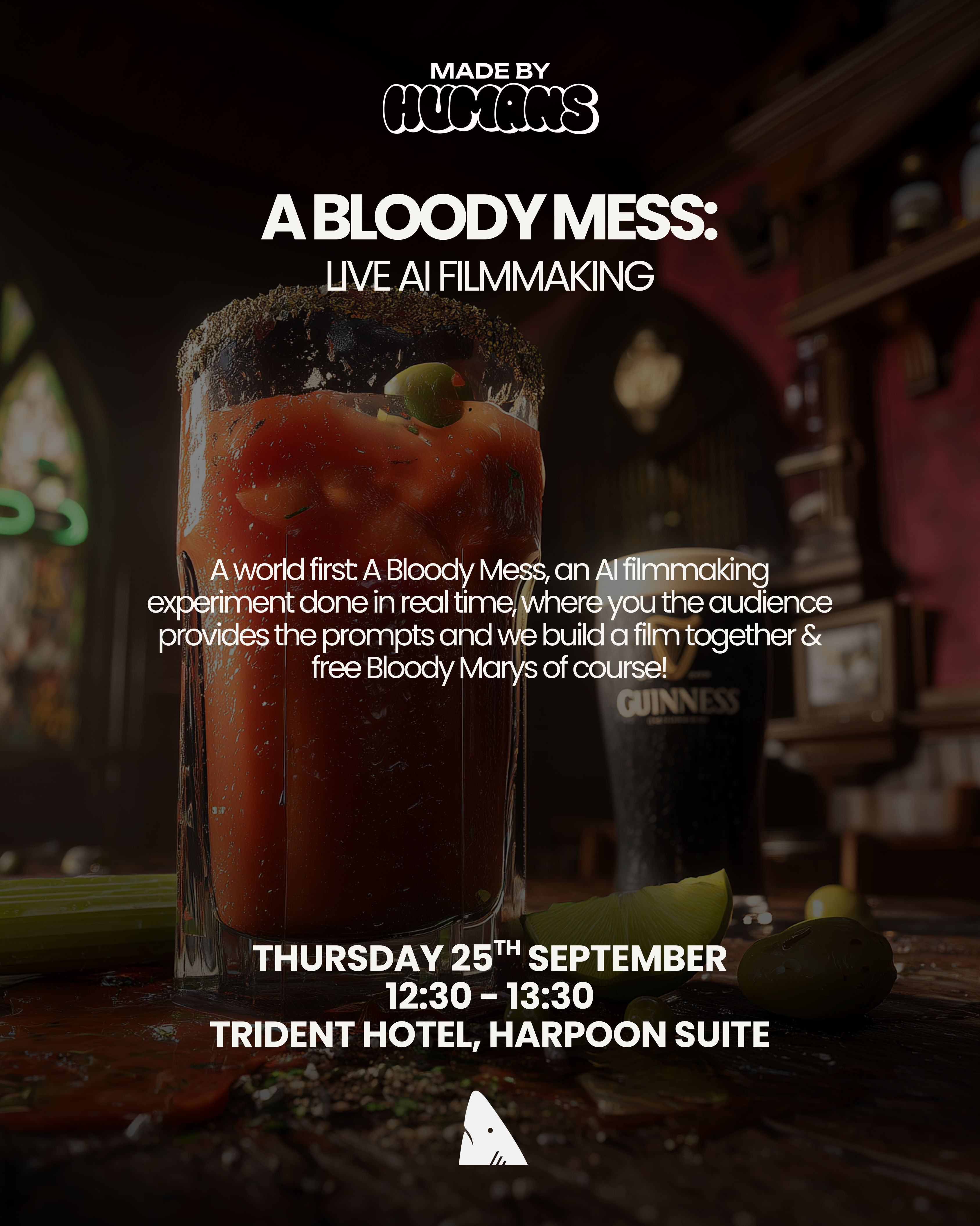 This year is extra special because Imagine This, my production company and Made By Humans our AI artist roster, are sponsoring the festival. We’re hosting not one but two events. On Thursday, a world first: A Bloody Mess, an AI filmmaking experiment done in real time, where the audience provides the prompts and we build a film together - all while serving free Bloody Marys (of course). 12:30pm Thursday 25th Sept at the Trident Hotel. And on Saturday 27th Sept, we’re throwing the official closing party: One Last Guinness with Imagine This at the Acton's Garden Bar.