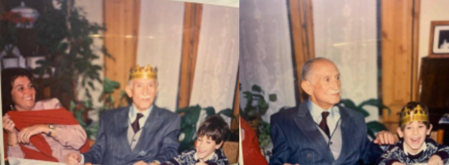 After breakfast, the day turns into a joyful little pilgrimage, hopping from one set of grandparents to the next, collecting 'one more' present at each stop. Eventually you land at Tía Carmen’s, where the kitchen is somehow fuller than the living room; it’s so packed that people spill into the hallway, all of us grazing on jamón and savoury puff-pastry bites until someone calls out, 'A la mesa!' Twenty-eight of us last year, stacked onto extra tables, sofas shoved aside to make space for one more chair. There are laughs, a few tears, and the kind of rituals that only families understand: the four older aunts (the sisters) getting neulas crumbled dramatically over their heads, then everyone gathering for the tortel de Reyes. If you get the bean, you’re buying next year’s cake for the whole family; if you find the tiny porcelain King, you win the golden paper crown. In that photo, it was Lucas, and honestly, it’s him more often than not. Lucky boy.”