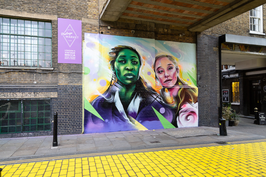 Mr Cenz took real pleasure in creating a mural for this unmissable film event in his signature style. Bringing Elphaba and Glinda to life, the artwork captures the magic of their characters whilst staying true to the life of Brick Lane.
