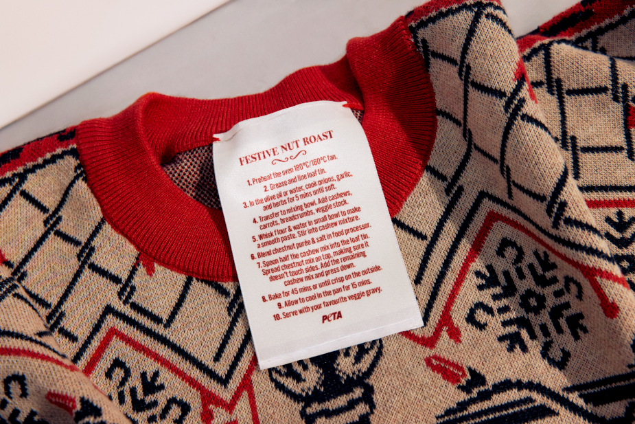 At the centre of the campaign are three limited-edition jumpers, each depicting the brutal reality faced by cows, pigs and turkeys over the festive season. What appears at first glance to be cheerful holiday knits are in fact graphic subversions of traditional holiday imagery, with blood spatter and slaughter scenes replacing snowflakes and reindeers. In addition, stitched into each jumper’s label is a recipe for a delicious festive nut roast as a substitute for meat-eating traditions.