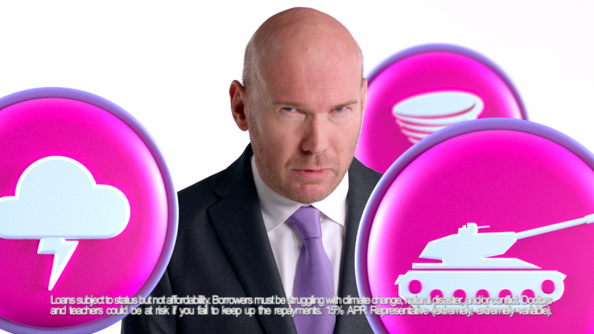 The satirical 90-second commercial, written by Jim De Zoete, uses the familiar language and aesthetic of early-2000s daytime TV adverts to reveal the absurdity of a broken financial system. Macqueen’s character offers outrageous deals in an ill-fitting suit, surrounded by dodgy graphics and sinister undertones.