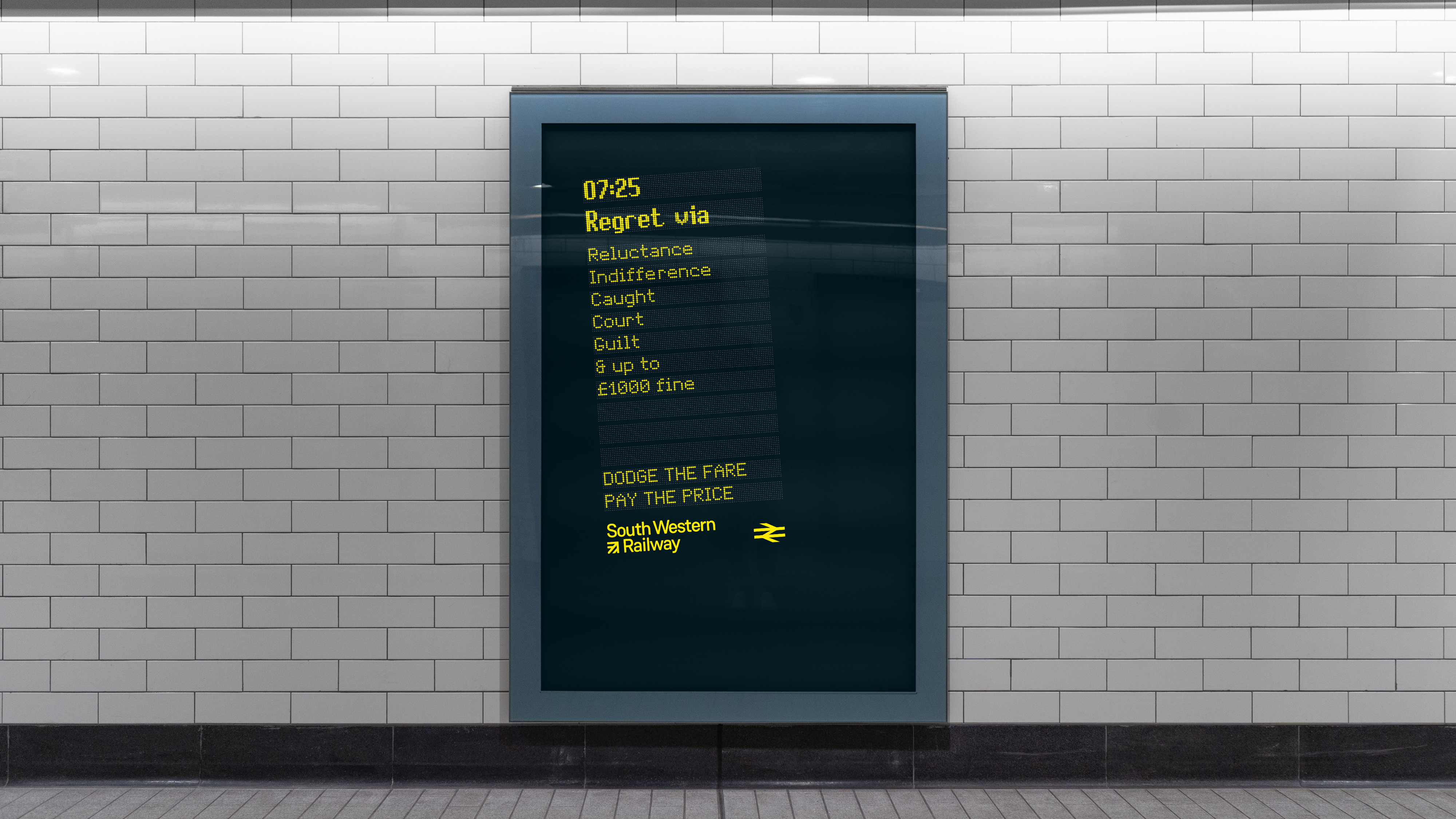 Instead of the names of stations, however, the destinations are the negative emotions that being caught without the right ticket can cause. Destination Regret, for example, calls at the stations Indifference, Caught, Court, Guilt and Up to £1,000 Fine. Other executions outline journeys to Disgrace and Shame, with all the creative using the endline 'Dodge the fare, pay the price'.