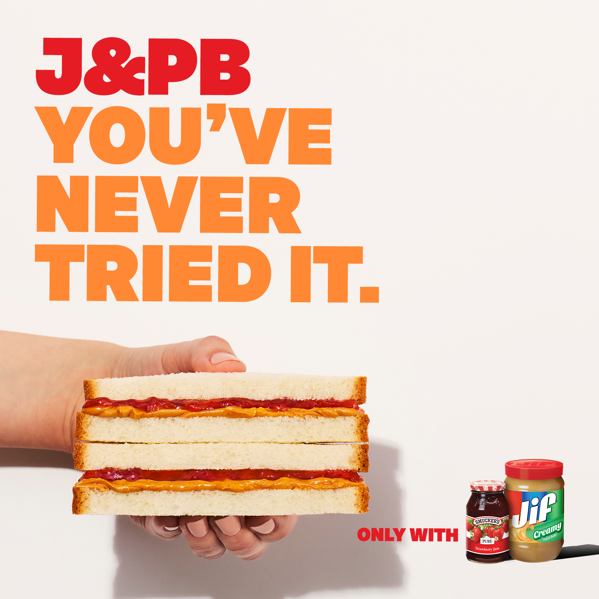 Bready or not, the J&PB is here. Smucker’s® and Jif® have put a playful twist on one of the world’s most iconic sandwiches: the peanut butter and jam. Meet the J&PB — jam on top, peanut butter on the bottom.