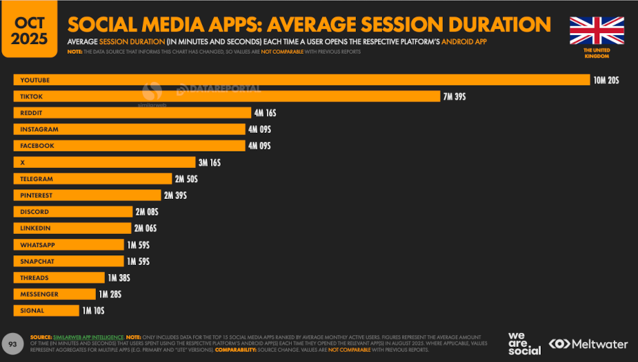 YouTube is capturing the UK’s attention, with an average session on the platform lasting 10m 20s, followed by TikTok (7m 39s) and Reddit (4m16s). When it comes to how often people are opening their social apps, Snapchat enters the top three: WhatsApp (17.5 times per day), Snapchat (11.6) and Instagram (11.1).