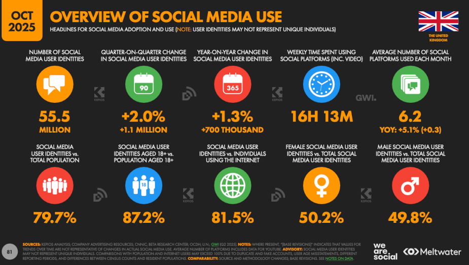 According to the report, there are 68.1 million individuals using the internet and 55.5 million social media user identities in the UK. Social media users spend 16h 13m weekly on social channels, using an average of 6.2 platforms each month - lower than the global average of 18h 36m and 6.75 platforms.