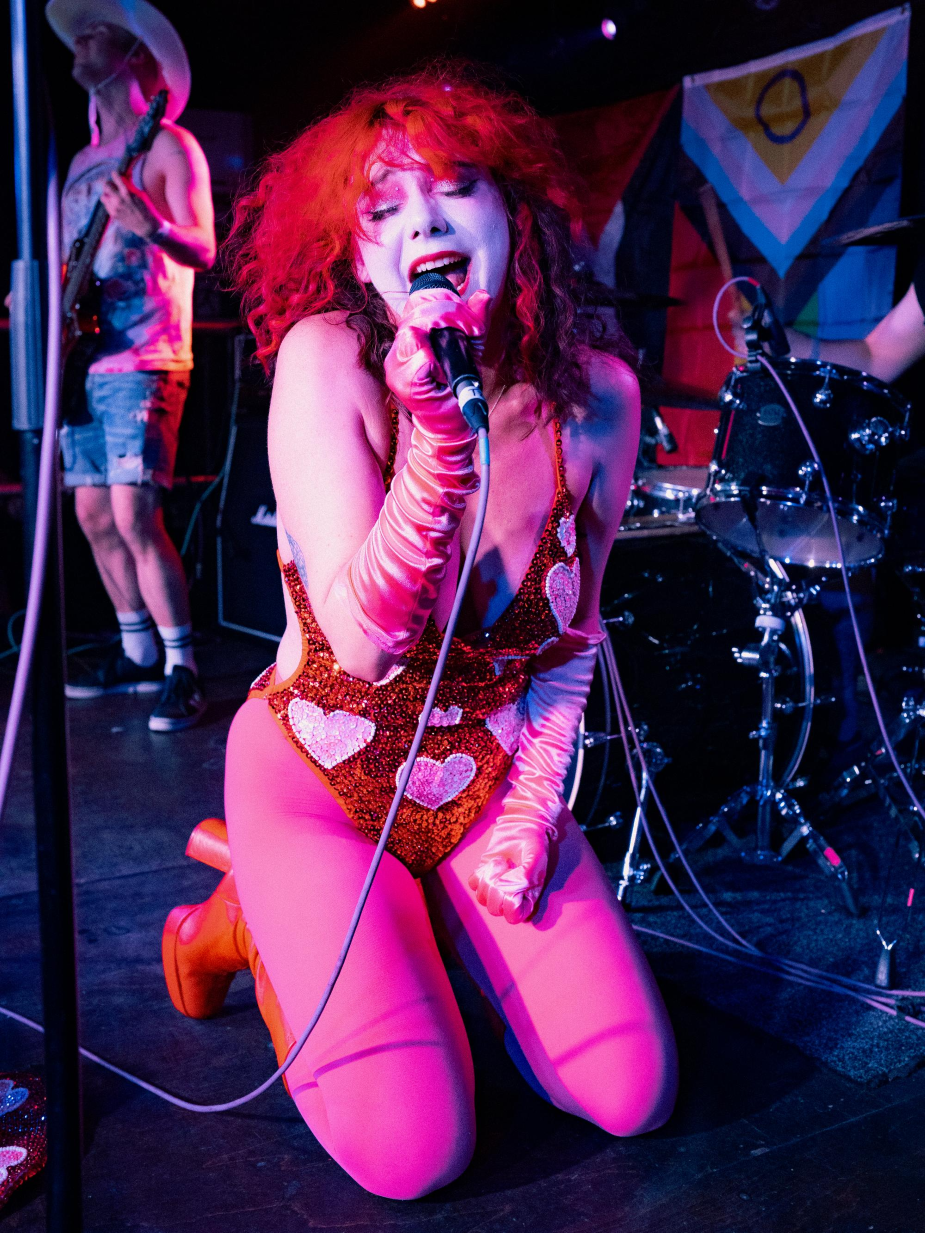 It’s involved gathering a band of incredibly talented musicians to perform with, honing my drag make up skills (including eyebrow blocking, which I’m very proud of), creating costumes out of various niche Vinted finds, and become a pseudo creative director – curating the performance itself and working with my bassist to design and print stickers to sell at our shows.