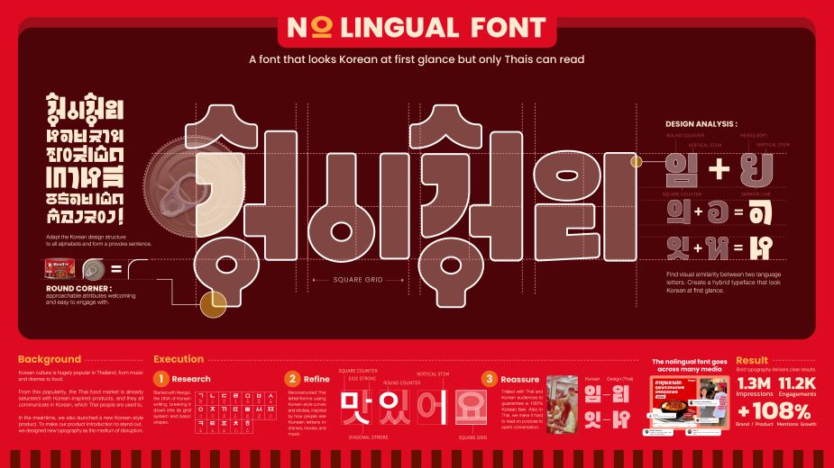 Another highlight is ‘Nolingual Font’, which promoted a new product, Fried Baby Clams with Spicy Sauce Korean Style. The idea was built around typography that looks Korean at first glance, but can only be read by Thai people. The project won several awards in design categories. However, what I value most about this work is the design process itself. It involved research and surveys to ensure that the typography communicated exactly what we intended, proving that even design-led work can be grounded in insight and strategy.