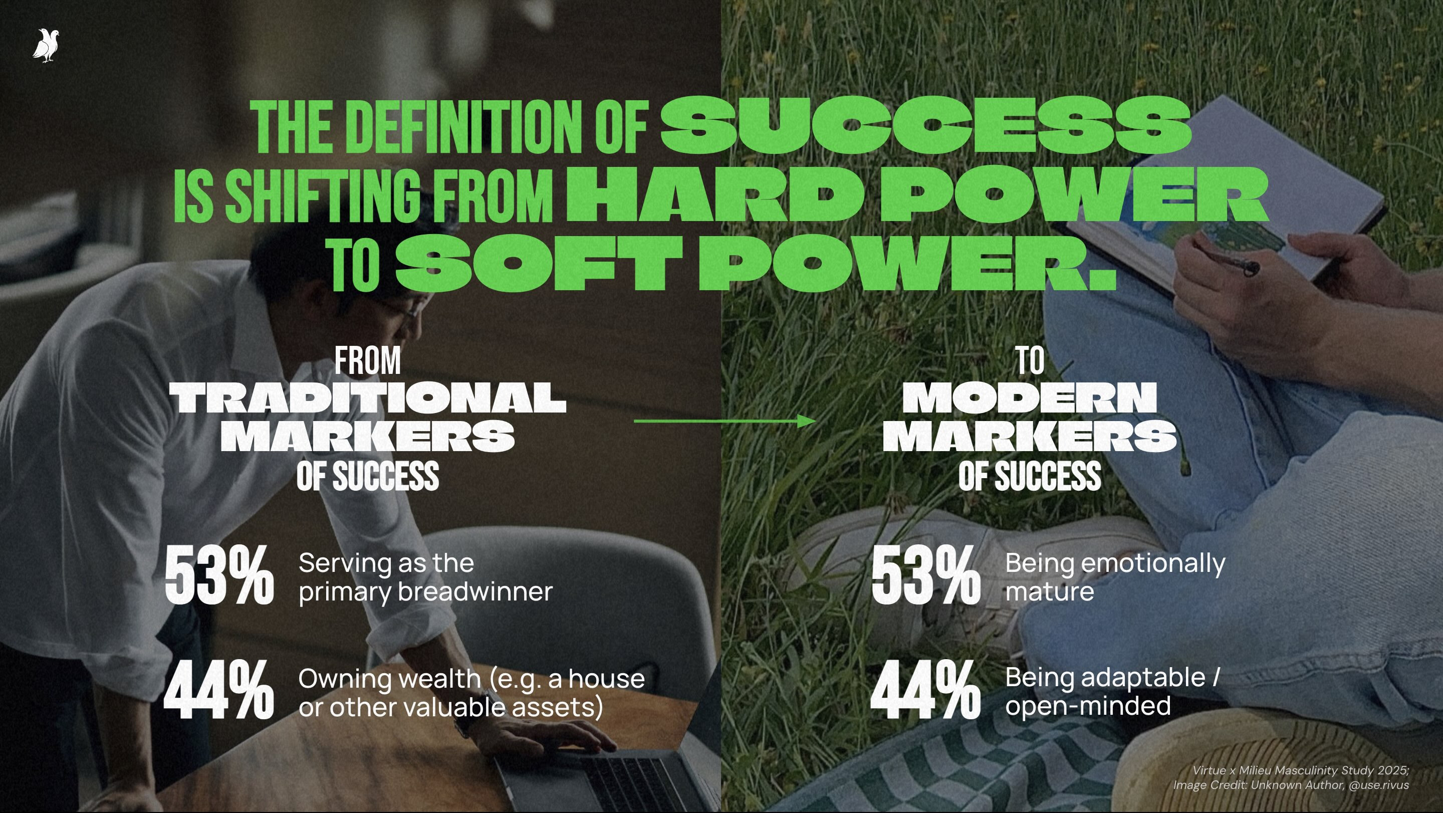 Success once meant control over wealth, work, and the world around them, but that scoreboard is shifting. Today, achievement is measured less by hard power, dominance and control; and more by soft power, by how men lead, care, and connect. The old markers of power still linger, but they’re being rewritten in real time.