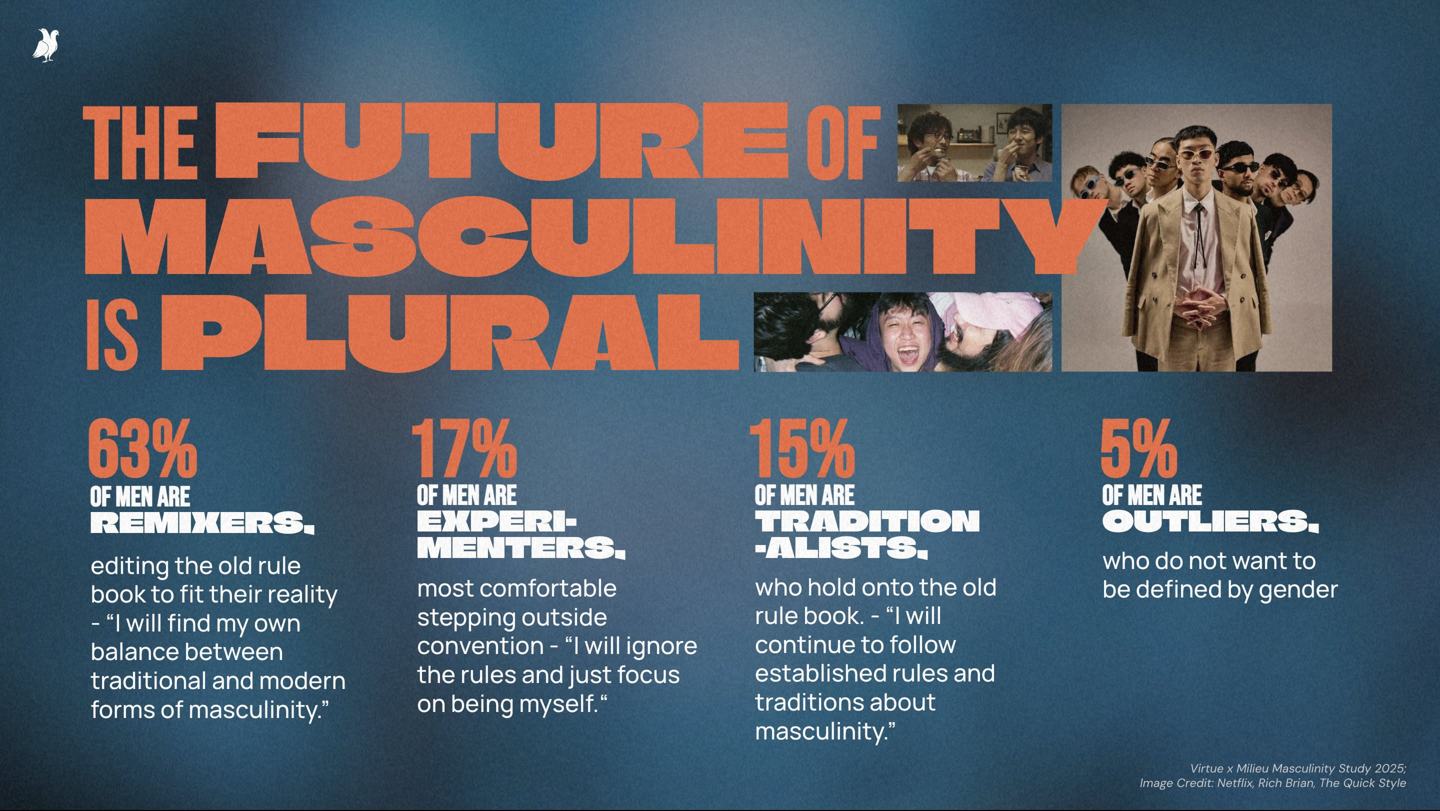According to ‘The VIRTUE Guide To Modern Masculinity’, today’s masculinity isn’t about conforming to a single standard, but navigating a shifting mix of ambition, vulnerability, balance, and self-expression. As this plural landscape takes shape and cultural scripts loosen, this shift opens up a powerful moment for brands to help men navigate and express a more expansive version of manhood.