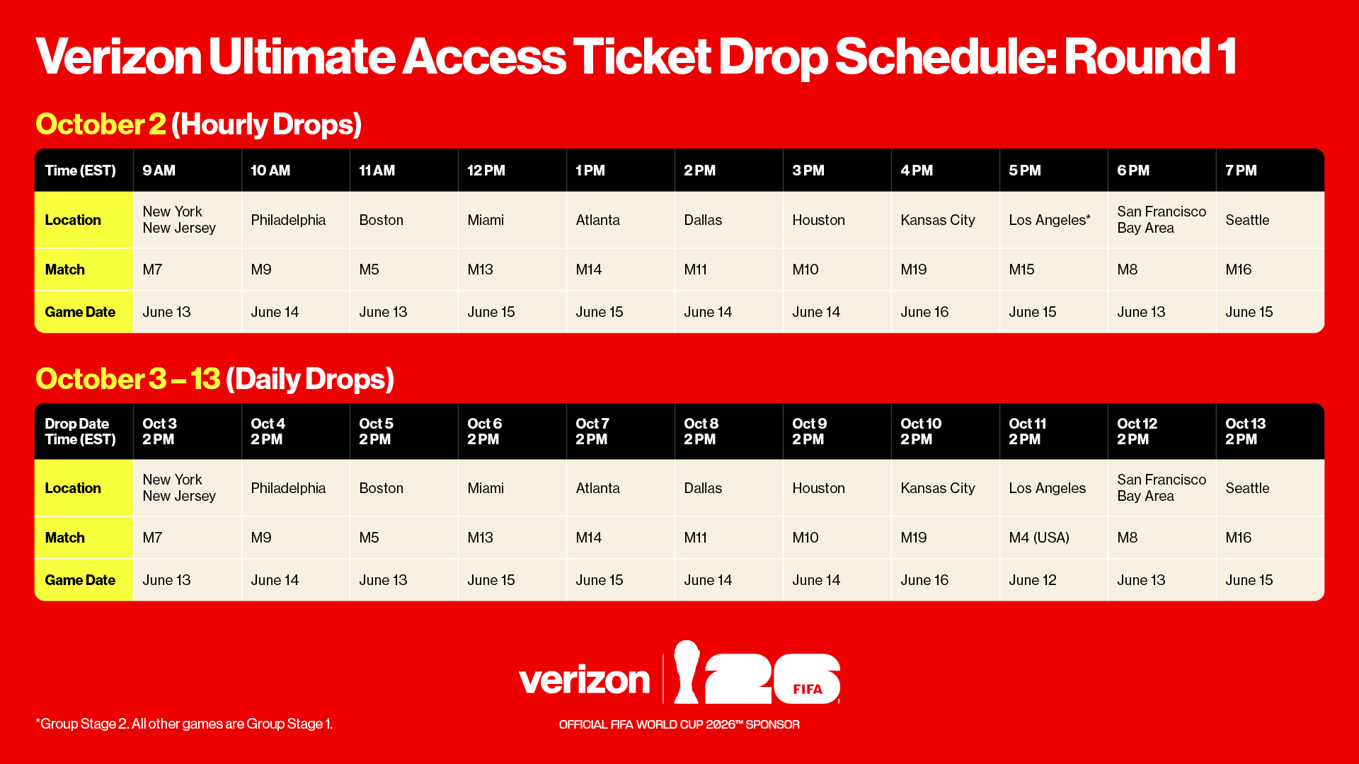 Verizon will drop free tickets starting Thursday, October 2 at 9:00AM EST that will be available for US customers to claim on a first-come, first-served basis in the My Verizon app via Verizon Access, the company's premium access program that rewards customers with unparalleled experiences, free giveaways and tickets to highly sought-after events including sports games, concerts, movie premieres and more – no strings attached, just for being a Verizon customer. Additional ticket drops will take place throughout the road to the FIFA World Cup and will be announced in My Verizon app and at Verizon.com/Access.