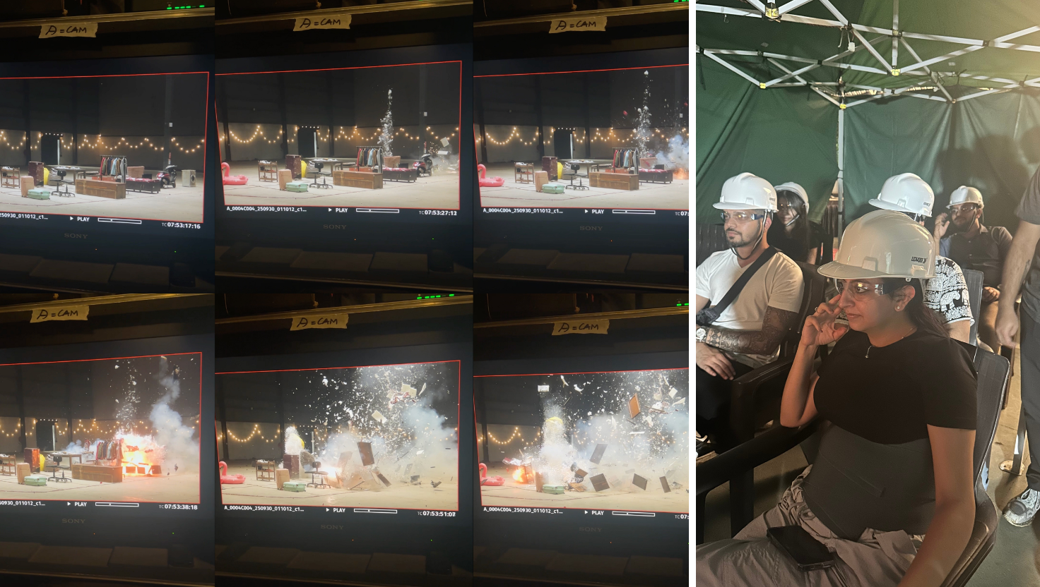 “The explosion scene was a bit chaotic at first,” Neville says. Originally shot on farmland, the entire field was a washout when it unexpectedly rained. “The explosives got damp, and the shots weren’t as dramatic as we’d hoped. So, we ended up reshooting indoors to get it exactly how we envisioned it.”