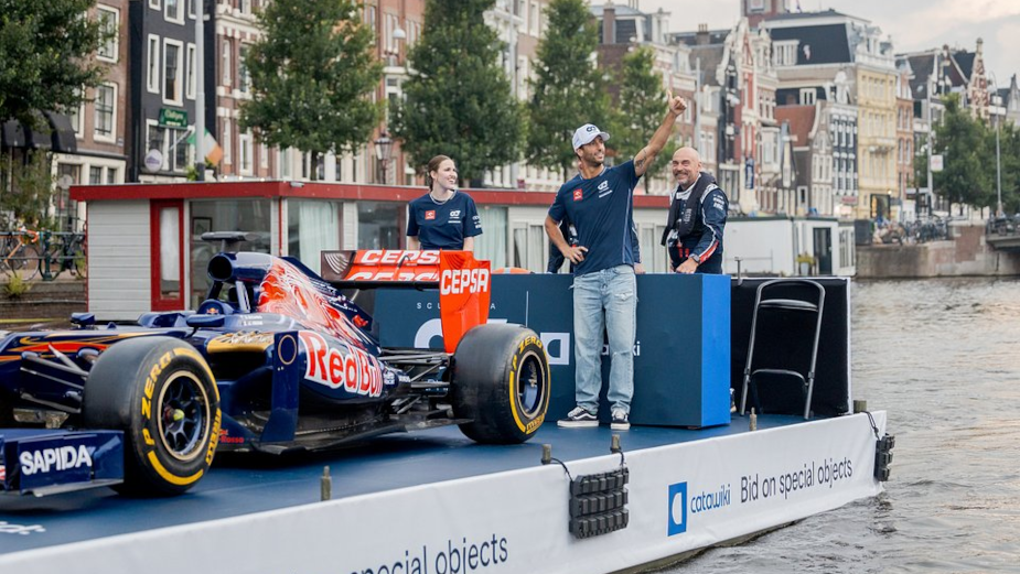 It must have been a rare view for Amsterdam inhabitants today, with Daniel Ricciardo taking his former Formula 1 car for a spin on the Amsterdam canals. The remarkable ride from M&C Saatchi Sport & Entertainment Amsterdam unveiled the new online auction ‘A Decade of Daniel’ by Scuderia AlphaTauri on Catawiki, the online marketplace for special objects. The auction celebrates Ricciardo’s Formula 1 career and features several objects from his legacy, offering fans the opportunity to own a piece of racing history. Part of the proceeds of the special auction will be donated to the not-for-profit foundation Wings for Life, which is dedicated to finding a cure for spinal cord injury.