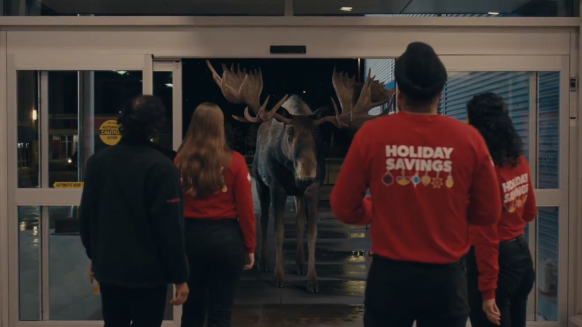 Kyle> It's funny you say that because throughout this process we explored so many different tones. From super slapstick and goofy to super earnest and heartfelt. As the ad started to come together, it began to make more sense for the moose to represent this outsider, but he's not too sad. The viewer can tell he wants something but we were balancing his wanting for togetherness with the warmth and togetherness that is taking place inside the Real Canadian Superstore. And then eventually he does get that, right at the end. Making the moose a little bit more photorealistic, instead of cartoonish and goofy, helped make the whole thing feel a little bit more real and relatable.