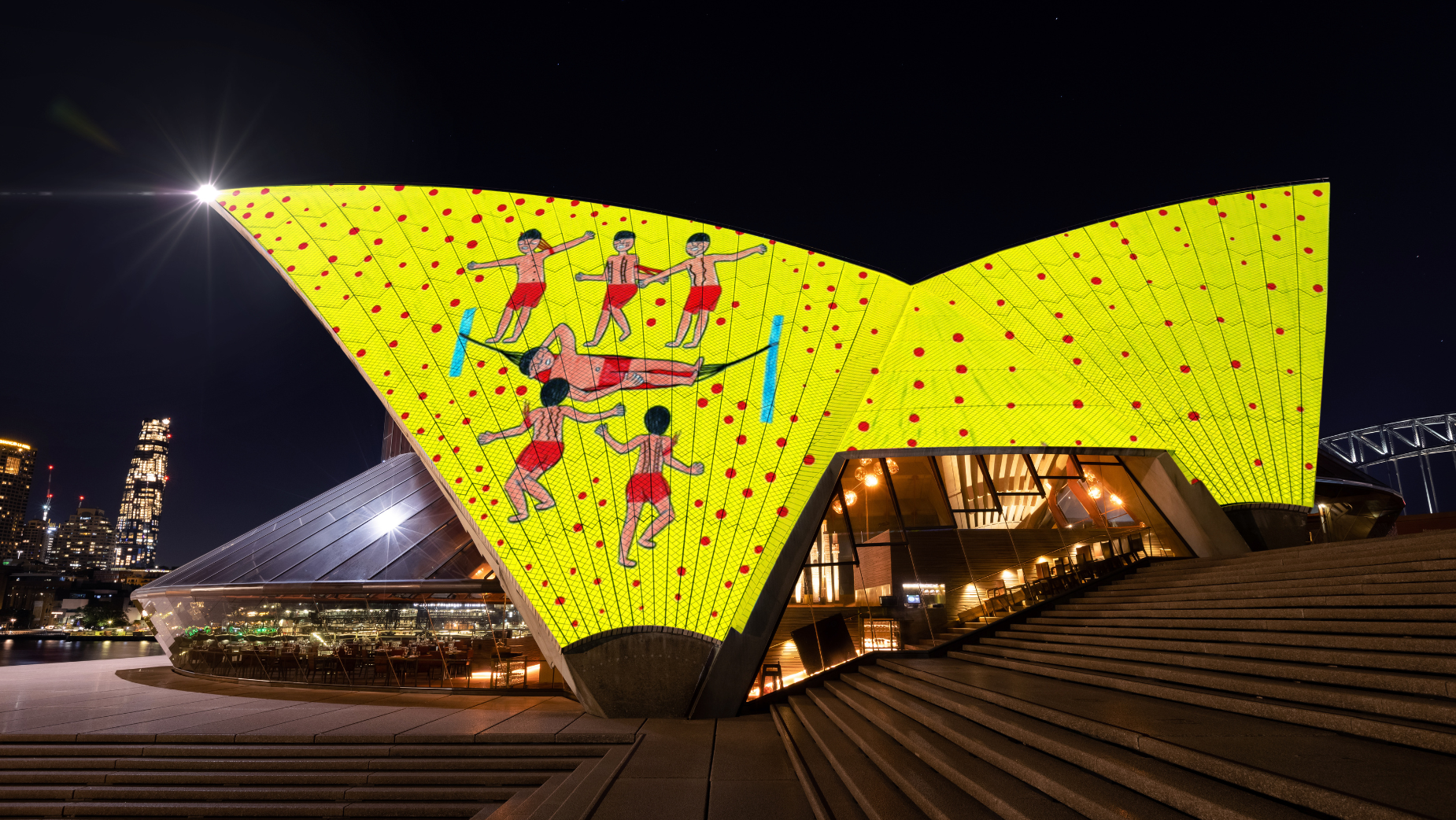 Created in collaboration with the Sydney Opera House, Biennale of Sydney, and Fondation Cartier pour l’art contemporain, Badu Gili: Healing Spirit celebrates stories of ritual and intergenerational knowledge. The work brings together the art of Marilyn Russell, Steven Russell, and their late mother Esme Timbery of the Bidjigal people, alongside Joseca Mokahesi Yanomami of the Yanomami people in the Brazilian Amazon.