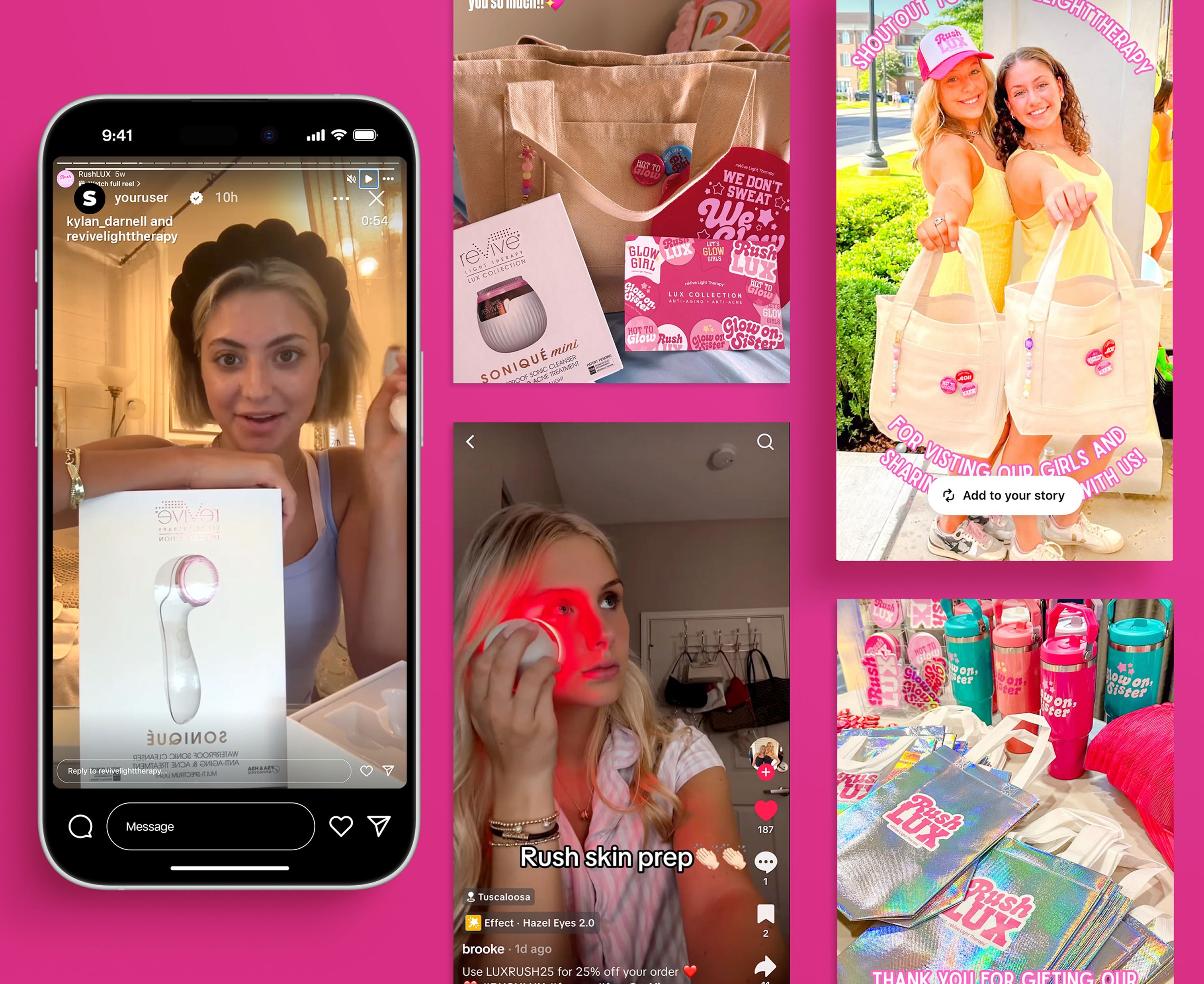 We launched Glow On, Sister, a campaign designed to seamlessly match RushTok’s humor, energy, and aesthetic. Out of this umbrella, we created RushLux—a multi-channel activation that included hand-delivered light therapy skincare kits to sorority houses, cheeky sisterhood-inspired messaging, and outdoor boards and on-campus visibility. These efforts introduced the reVive Light Therapy™ Lux Collection’s bestselling devices to an entirely new audience, driving both awareness and engagement. The campaign spanned TikTok, Instagram, email, and Snapchat, combining creator-style content, gifted products with on-site education and activation, and playful promo codes to drive both engagement and conversion.