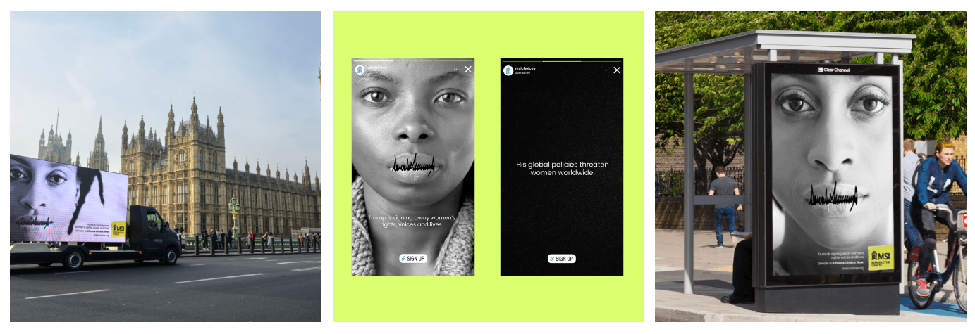Within 24 hours, MSI Reproductive Choices responded with a simple, yet powerful campaign. Featuring striking close-up shots of women with Donald Trump’s distinctive signature covering their mouths – giving the impression their mouths are ‘sewn shut’. The copy reads, ‘Don’t let Trump sign away women’s rights, voices and lives.’